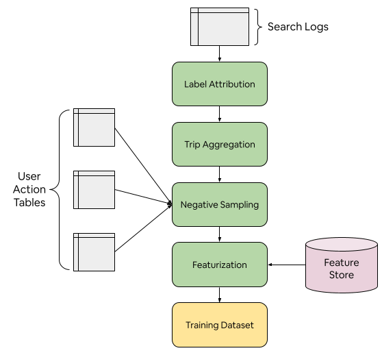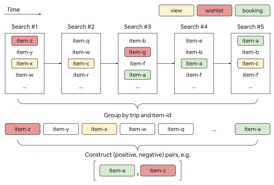 Diving deeper, we first grouped all historical queries of users who made bookings, using key query parameters such as location, number of guests, and length of stay — our definition of a “trip.” For each trip, we analyzed all searches performed by the user, with the final booked listing as the positive label. To construct (positive, negative) pairs, we paired this booked listing with other homes the user had seen but not booked. Negative labels were selected from homes the user encountered in search results, along with those they had interacted with more intentfully — such as by wishlisting — but ultimately did not book. This choice of negative labels was key: Randomly sampling homes made the problem too easy and resulted in poor model performance.