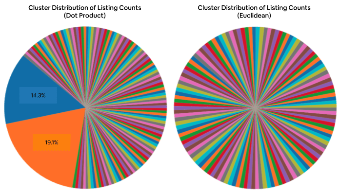 Figure 6: Example of the distribution of cluster sizes when using dot product vs. Euclidean distance as a similarity measure. We found that Euclidean distance produced much more balanced cluster sizes.