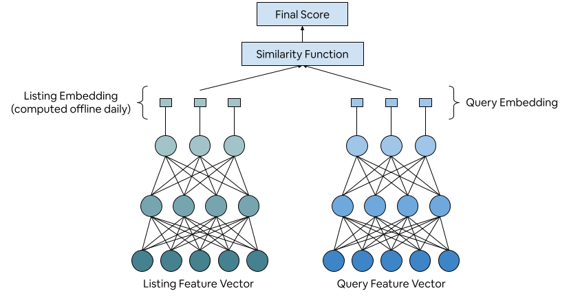 A key design decision here was choosing features such that the listing tower could be computed offline on a daily basis. This enabled us to pre-compute the home embeddings in a daily batch job, significantly reducing online latency, since only the query tower had to be evaluated in real-time for incoming search requests.