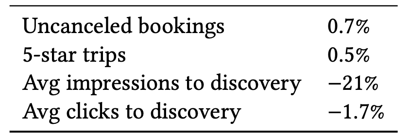 The reduction in the average impressions to discovery metric in Figure 4 denotes the fewer number of map pins a searcher has to process before clicking the listing that they eventually book. Similarly, the reduction in average clicks to discovery shows the fewer number of map pins a searcher has to click through to find the listing they booked.