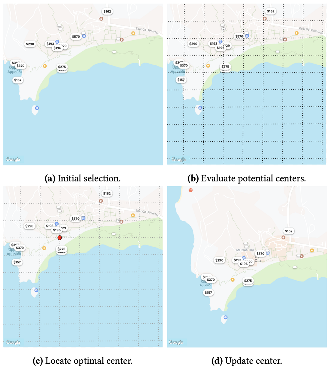 To maximize the chances that a searcher will discover the listings with the highest booking probabilities, we design an algorithm that re-centers the map such that the listings with the highest booking probabilities appear closer to the center. The steps of this algorithm are illustrated in Figure 9, where a range of potential coordinates are evaluated and the one which is closer to the listings with the highest booking probabilities is chosen as the new center.