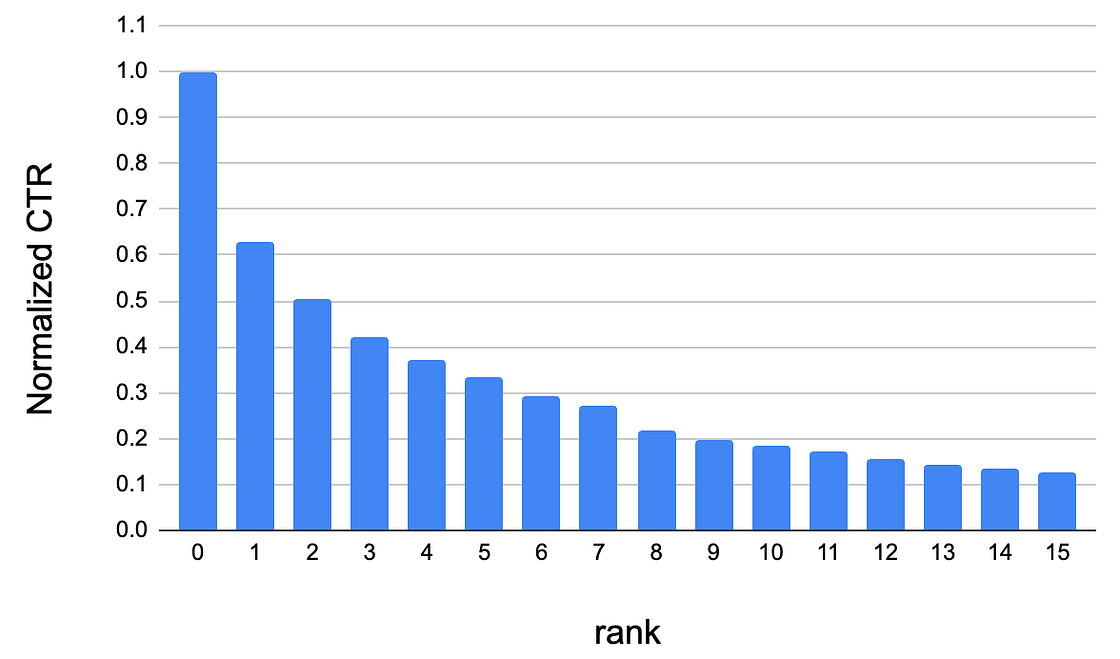 The central concept that drives ranking for list-results is that user attention decays starting from the top of the list, going down towards the bottom. A plot of rank vs click-through rates in Figure 1 illustrates this concept. X-axis represents the rank of listings in search results. Y-axis represents the click-through rate (CTR) for listings at the particular rank.