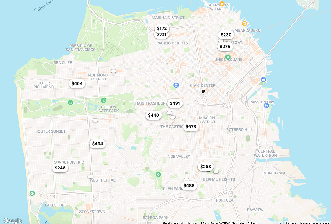 In our next iteration of modeling user attention, we separate the map pins into two tiers. The listings with the highest booking probabilities are displayed as regular oval pins with price. Listings with comparatively lower booking probabilities are displayed as smaller ovals without price, referred to as mini-pins (Figure 5). By design, mini-pins draw less user attention, with click-through rates about 8x less than regular pins.