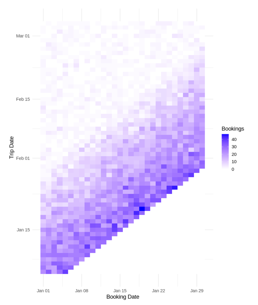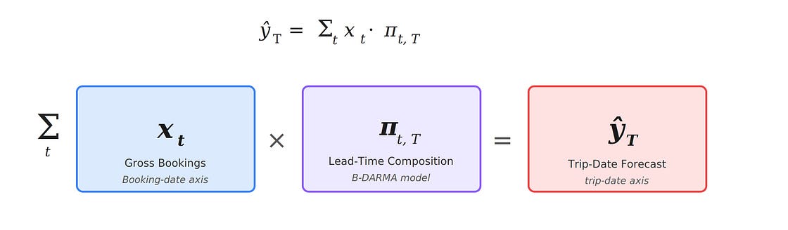 - Lead-time composition. Of the bookings recorded today, what fraction correspond to trips happening in each future time window? This is a compositional time series, a vector of proportions which must sum to one. The final trip-date forecast is the product of the two: gross bookings, multiplied by the lead-time composition vector, so the booking-date axis generates the trip-date axis.