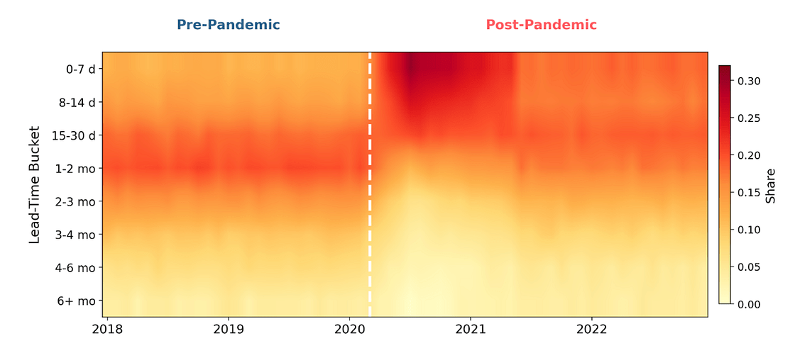 Here is where the story gets more interesting. By late 2021, gross booking volumes had largely recovered. You could look at top-line booking counts and conclude that things were back to normal. But when we looked at the lead-time compositions, the picture was different. The distributions had shifted during the pandemic and stayed shifted (Figure 3).
