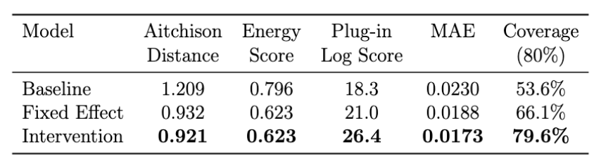 - The intervention model reduced Aitchison distance (the natural error metric for compositional data) by 31% compared to baseline.