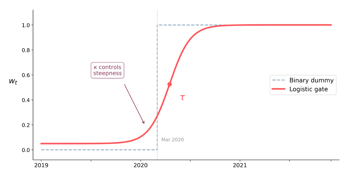 The logistic gate is the key. Instead of a binary before/after indicator, it learns a smooth S-shaped curve that ramps from 0 to 1 over a window of time. This means the model can represent both sudden shocks (steep curve) and gradual structural transitions (gentle slope), and crucially, it can project the transition forward into periods it has not yet observed (Figure 5).