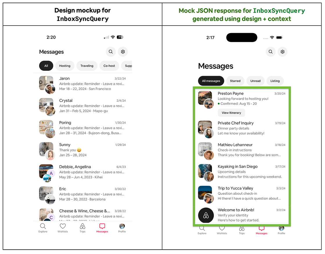 When this directive is present, Niobe alters the code that’s generated alongside the mock data to include extra details about this annotation. At runtime, the GraphQL client uses this to load the generated mock data, then seamlessly returns the mocked response instead of using data from the server. This effectively allows client engineers to unblock themselves from waiting on the server implementation, since they can easily use locally mocked data when querying unimplemented fields. The screenshot of the inbox screen earlier in this post is actually a real screenshot that was taken by generating with these two directives and running the Airbnb app in an iOS simulator — no manual mocking, proxying, or response modification needed!