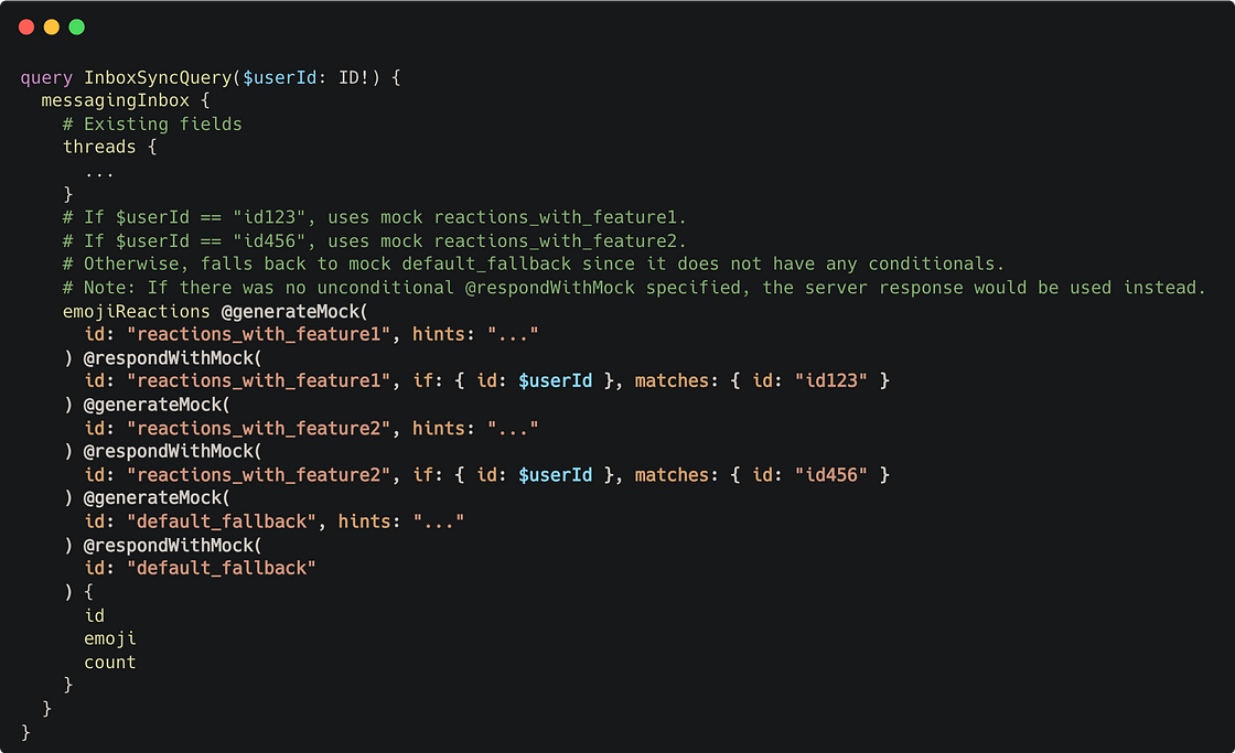 @respondWithMock can also be specified on individual fields. When used on fields within a query instead of on the query itself, the GraphQL client will actually request all fields from the server except those annotated with @respondWithMock, then patch in locally mocked data for the remaining fields — producing a hybrid of production and mock data, and making it possible for client engineers to develop against new (unimplemented) fields in existing queries. Engineers can even repeat this directive and use query input variables to decide if and when to return a specific generated mock at runtime, as shown below: