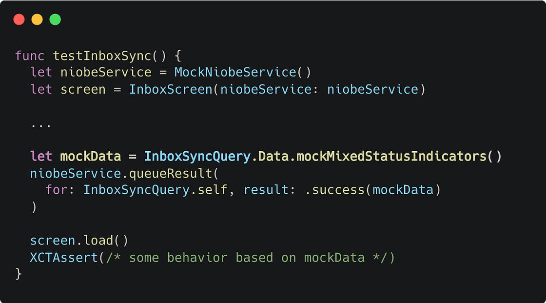 During code generation, Niobe produces both a JSON file containing the actual mock data for each @generateMock directive, as well as a source file that provides functions for loading and consuming mock data from demo apps, snapshot tests, and unit tests. As shown in the Swift code below, the mockMixedStatusIndicators() function is generated on the InboxSyncQuery’s root Data type. It provides access to an instantiated type that’s populated with the generated mock data for mixed_status_indicators, allowing engineers to use the mock without having to load the JSON data manually: