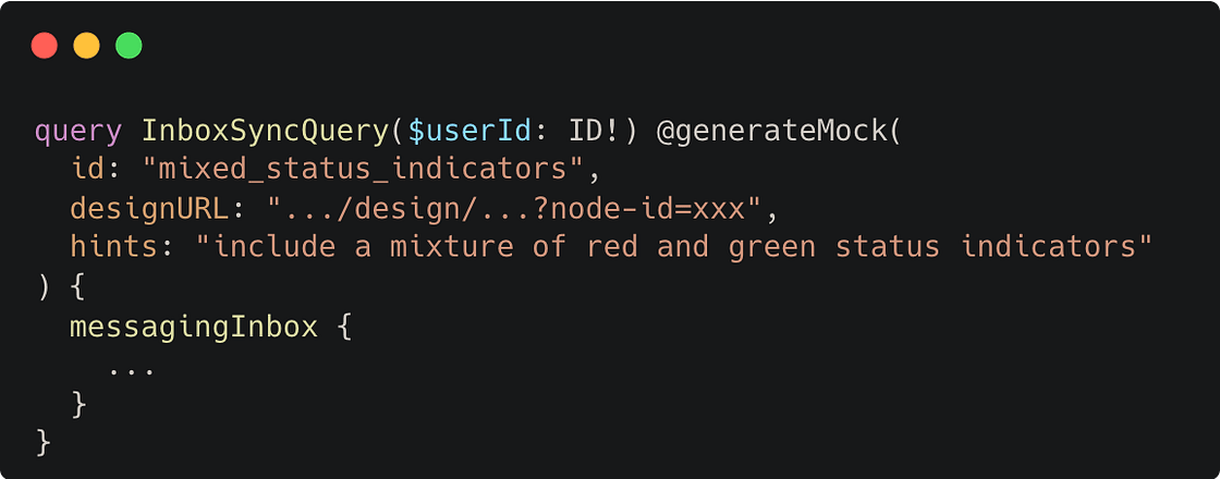 To generate mock data while keeping engineers in their local focus loops, we introduced a new client GraphQL directive called @generateMock, which engineers can use to automatically generate mock data for a given GraphQL operation, fragment, or field: