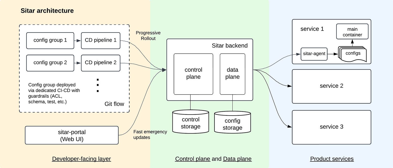 At Airbnb, Sitar is the internal name for our dynamic config platform. It provides a common way for teams to manage runtime behavior safely. At a high level, Sitar has four main parts: a developer-facing layer, a control plane, a data plane, and the clients and agents that run alongside application code.